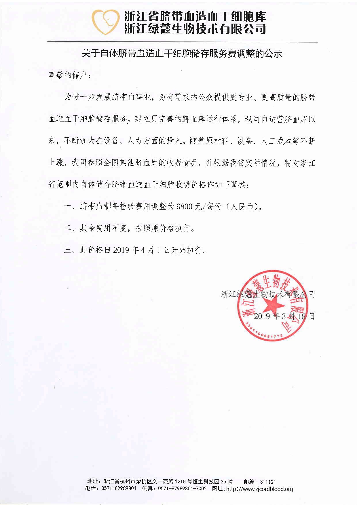 关于自体脐带血造血干细胞储存服务费调整的公示