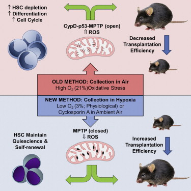 随后,研究人员通过亲环素d(cyclophilin d)和p53将ros的产生和线粒体通透性转换孔(MPTP)联系在一起作为EPHOSS的分子机制进行了实验探究。MPTP抑制剂--环胞素a能够保证在空气中收集小鼠骨髓和人类脐带血中的造血干细胞时避免发生EPHOSS反应,从而增加了可用于移植的造血干细胞数目。