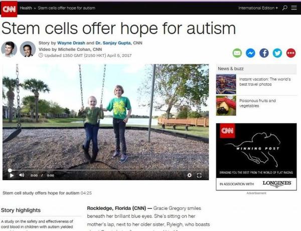 美国CNN电视台健康频道在4月6日下午5点报道了佛罗里达州罗克利奇市的一个脐带血干细胞减轻儿童自闭症症状与行为的临床试验。