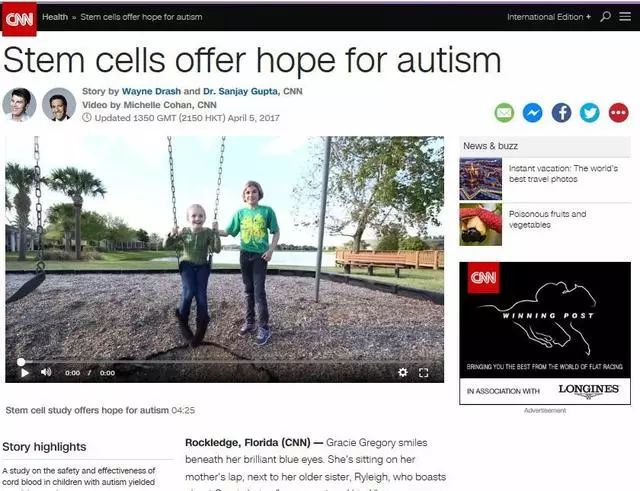 2017年,美国CNN电视台报道了佛罗里达州罗克利奇市的一个脐带血干细胞减轻儿童自闭症症状与行为的临床试验。