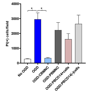 因为受损脑切片和脐带血细胞之间的直接细胞间接触并不是必需的。为了确定具体是哪一特定亚群的脐带血MNC发挥了保护活性作用,研究者去除了各种细胞类型的脐带血MNC,发现只有去除脐带血 CD14+单核细胞才能消除神经保护作用。