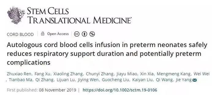 可喜的是,近些年来脐带血医学事业的发展为早产并发症患儿的治疗提供了新思路。广东省妇幼保健院杨杰、任竹潇、许芳等研究者曾通过一项非随机前瞻性临床试验发现,自体脐血单个核细胞输注可以减少早产儿呼吸支持时间,具有降低早产并发症发生率的潜力。日前,该研究结果发表在《干细胞转化医学》上。