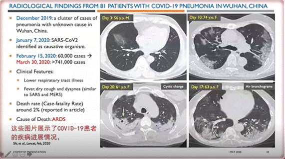 这些图片展示了COVID-19患者的疾病进展情况,显示了肺部炎症的进展情况。即使病毒载量很低而无法检测出来,但是一旦细胞因子风暴开始,就很难被控制,最终引发多个器官的衰竭。