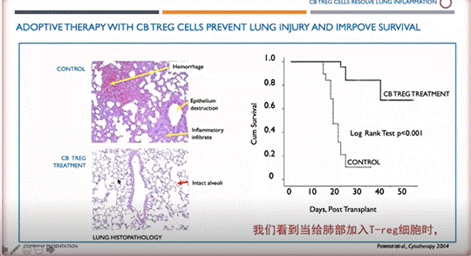 在Parmar教授的实验室里,通过试验模型生成了一些数据。在这个模型中通过放疗、细胞疗法去治疗肺部损伤。当给肺部加入T-reg细胞时,可以防止肺部发生出血、上皮损伤以及炎症,从而保证了肺部的完整性,进而提高了生存。