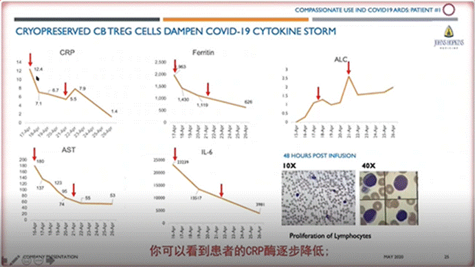 Parmar教授最近发表的论文介绍了这项研究,在这次COVID-19疫情期间,他们治疗了两个病人。第一位患者是患有自闭症的69岁养老院男性,他被送到医院时,多器官已发生衰竭,西鲁单抗与羟基氯喹治疗无效,因为他有肾损伤不能做透析而采用CVVH静脉血液过滤。从他入院2天后开始上呼吸机,后进行了脐带血来源T-reg细胞输注,病人完全脱离了重症。他的氧合功能改善了,整体情况明显好转。在治疗的10天后,病人已经拔掉了插管。