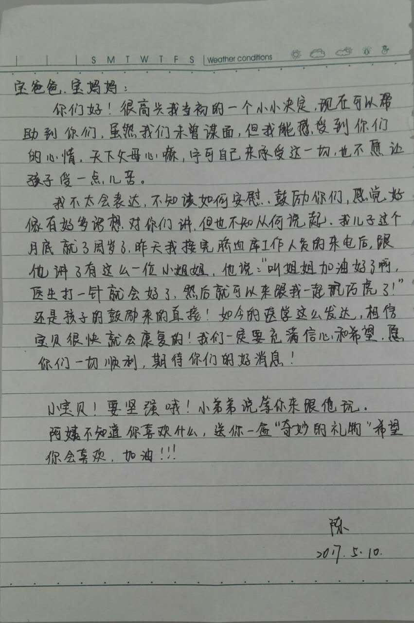更让人觉得温暖的是,这份脐血的捐献者陈女士在得知自己孩子的脐血被启用后,写了一封鼓励信给琳琳,鼓励琳琳相信现代医学,坚定康复的信心,同时也祝福琳琳早日康复。