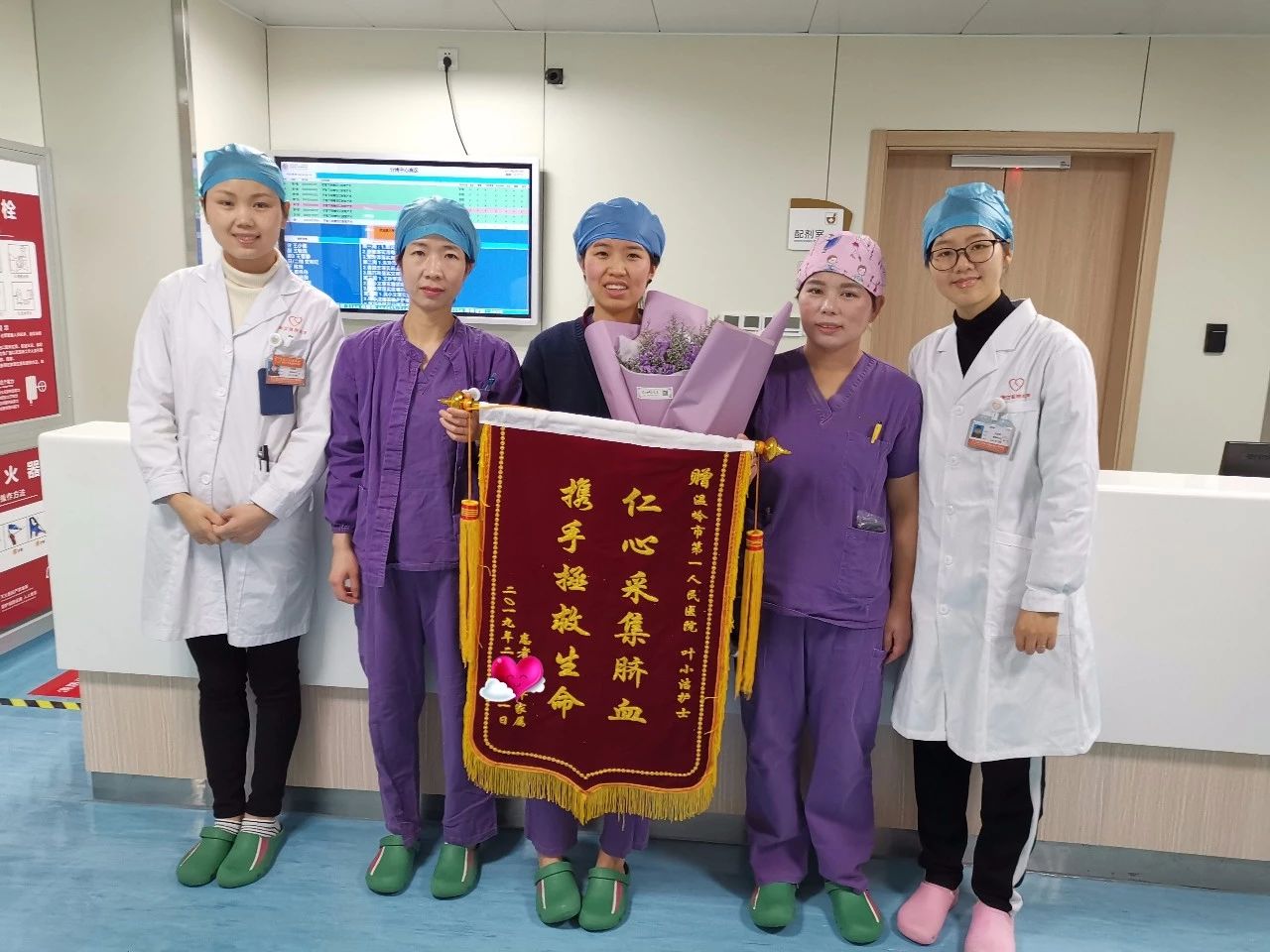 3月19日,浙江省脐血库受患者家属委托,将一面锦旗送往这份脐血的采集医院——温岭市第一人民医院,交到了采集人叶护士的手中。