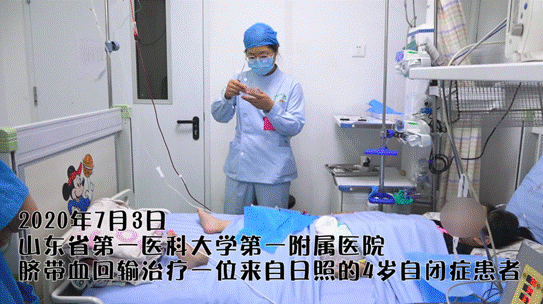2020年7月3日,来自日照的4岁的自闭症患儿妙妙(化名)在山东第一医科大学第一附属医院(山东省千佛山医院)接受了自体脐带血回输治疗。这也是千佛山医院儿童重症医学科自2020年4月底起的第六例自体脐带血回输治疗自闭症。