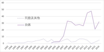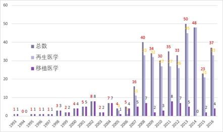 移植医学方向是指病人在放疗或化疗后通过脐带血移植治疗血液、免疫系统等疾病。2000 年以前年均应用 1.28 例,其后年均达到 4.35 例,数量稳定。