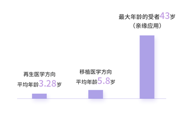 最大年龄的受者是 43 岁(亲缘应用)。另外,移植医学方向的受者平均年龄是 5.8 岁,再生医学方向的平均年龄是 3.28 岁。