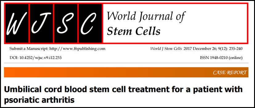 [1] Coutts M , Soriano R , Naidoo R , et al. Umbilical cord blood stem cell treatment for a patient with psoriatic arthritis[J]. World J Stem Cells, 2017(12):235-240.
