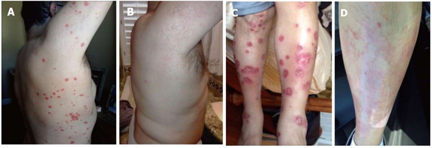 6个月以后,患者选择在美国一家干细胞机构继续进行三轮脐带血干细胞注射。第三次治疗后,银屑病斑块竟然神奇的消失不见了!(见图1B,D)。银屑病斑块几乎完全消失于躯干和四肢,剩下的少数斑块的体型明显缩小,红色更少,不再有鳞片。