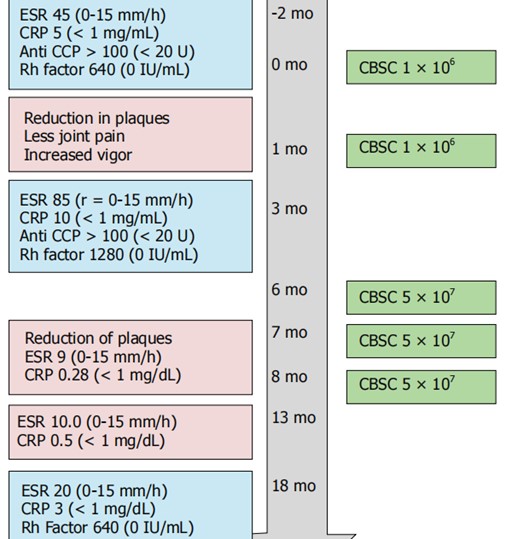 第四轮脐带血干细胞静脉注射后,红细胞沉积速率(ESR)和C-反应蛋白(CRP)的炎症标志物均在正常范围内。(ESR为9mm/h,CRP值为0.28 mg/dL)。最后一次注射脐带血干细胞 5个月后,ESR和CRP水平保持正常。