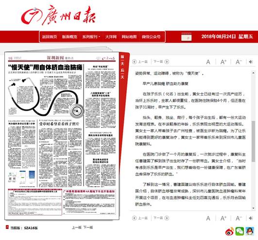 在医院门诊做了一个月的康复后,一次就诊过程中,康复科主任曹建国了解到孩子出生时存了一份脐带血。黄女士介绍,“当时考虑到乐乐是早产出生,我们想着给他一份健康保障,在广东省脐血库保存了乐乐的脐血。”