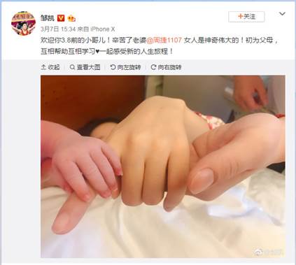 邹凯也在当天下午发文称:“欢迎你3.8前的小哥儿!初为父母,互相帮助互相学习,一起感受新的人生旅程!”