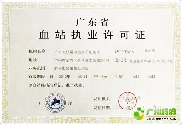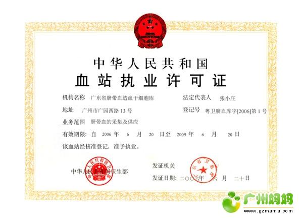 广东省脐带血库2006年获得卫生部和广东省卫生厅正式颁发的《血站执业许可证》