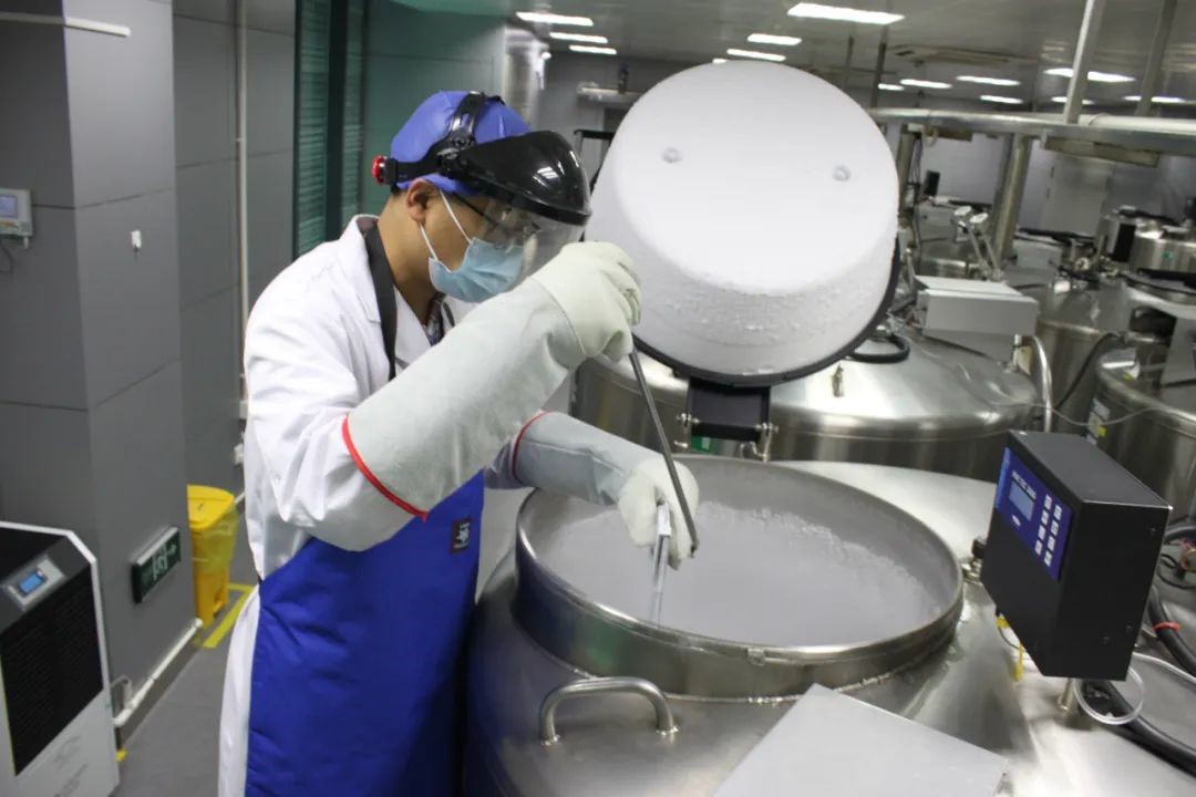 产科医生麻利地剪断脐带,将残留在脐带和胎盘中的血液收集了起来,这份珍贵的脐带血被送脐血库,经过检测、制备后,冻存在深低温液氮罐中储存。