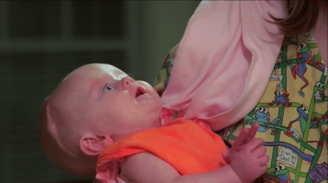现在,如果你仔细看格蕾丝,会发现她出生后第二天做分流手术留下的痕迹。这个手术帮助她从脑部逐渐排出液体,并将其引导回她的身体。