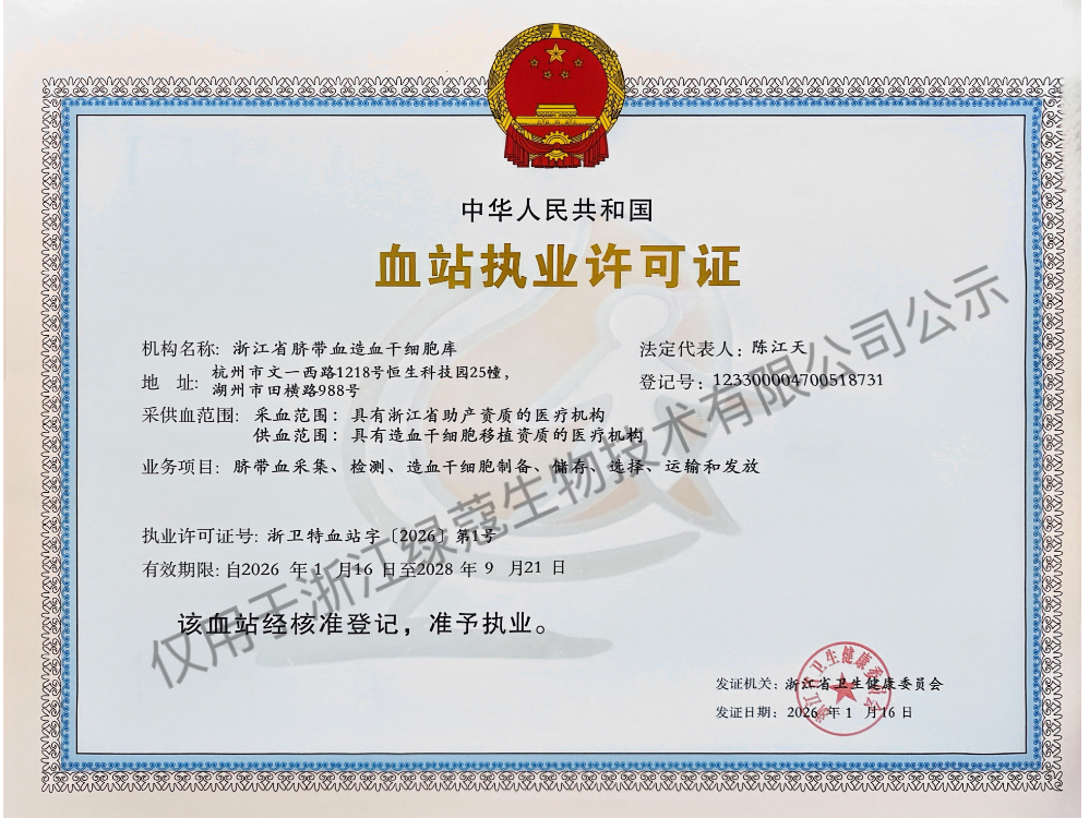 血站执业许可证:浙卫特血站字 [2026]第1号