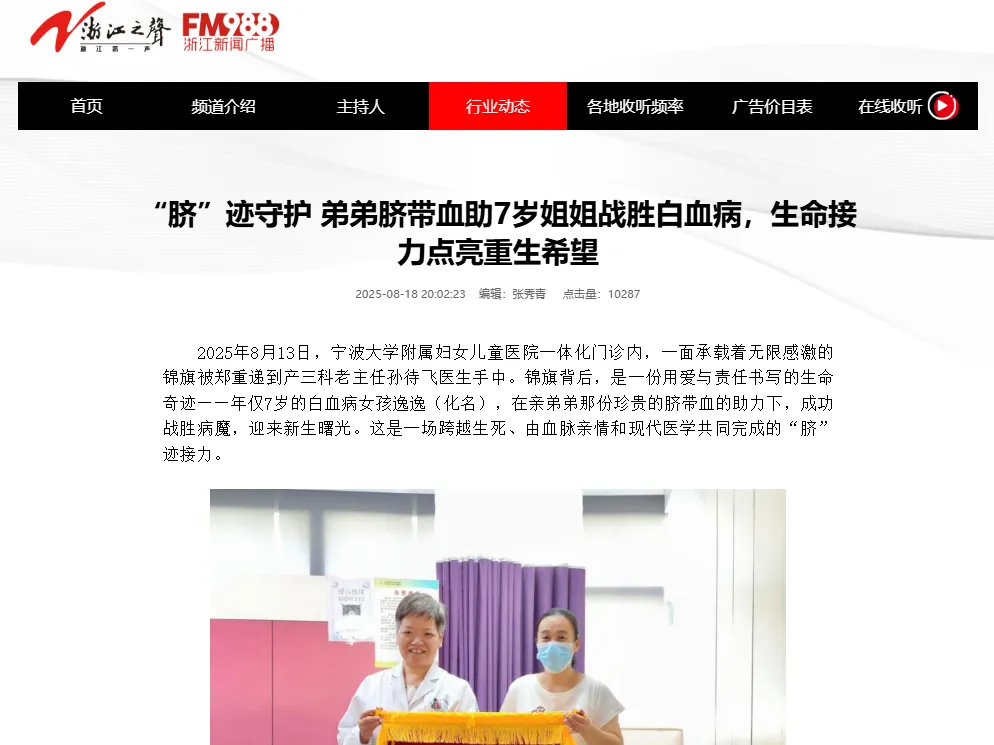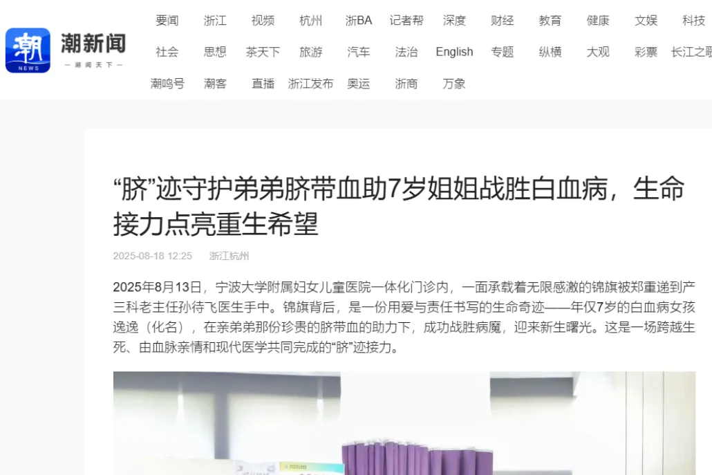 2025年8月13日,宁波大学附属妇女儿童医院一体化门诊内,一面承载着无限感激的锦旗被郑重递到产三科老主任孙待飞医生手中。锦旗背后,是一份用爱与责任书写的生命奇迹——年仅7岁的白血病女孩逸逸(化名),在亲弟弟那份珍贵的脐带血的助力下,成功战胜病魔,迎来新生曙光。这是一场跨越生死、由血脉亲情和现代医学共同完成的“脐”迹接力。