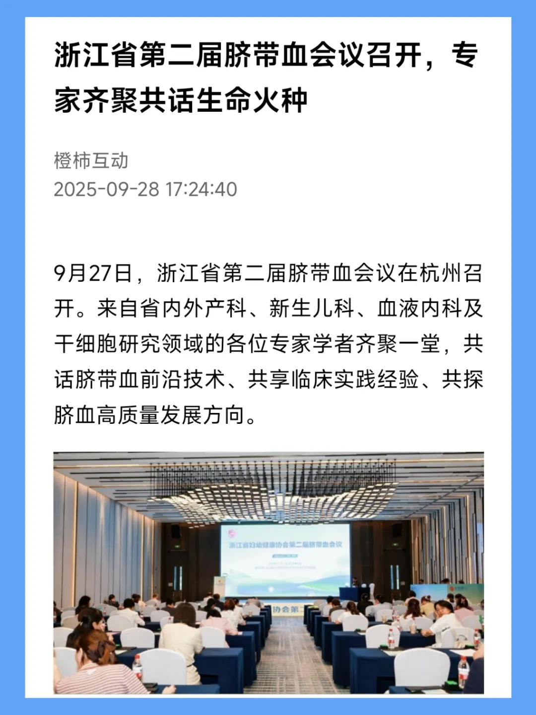 2025年9月27日,由浙江省妇幼健康协会主办、浙江省妇幼健康协会脐带血临床应用专业委员会承办的浙江省第二届脐带血会议在杭州隆重召开。来自省内外产科、新生儿科、血液内科及干细胞研究领域的各位专家学者齐聚一堂,共话脐带血前沿技术、共享临床实践经验、共探脐血高质量发展方向。